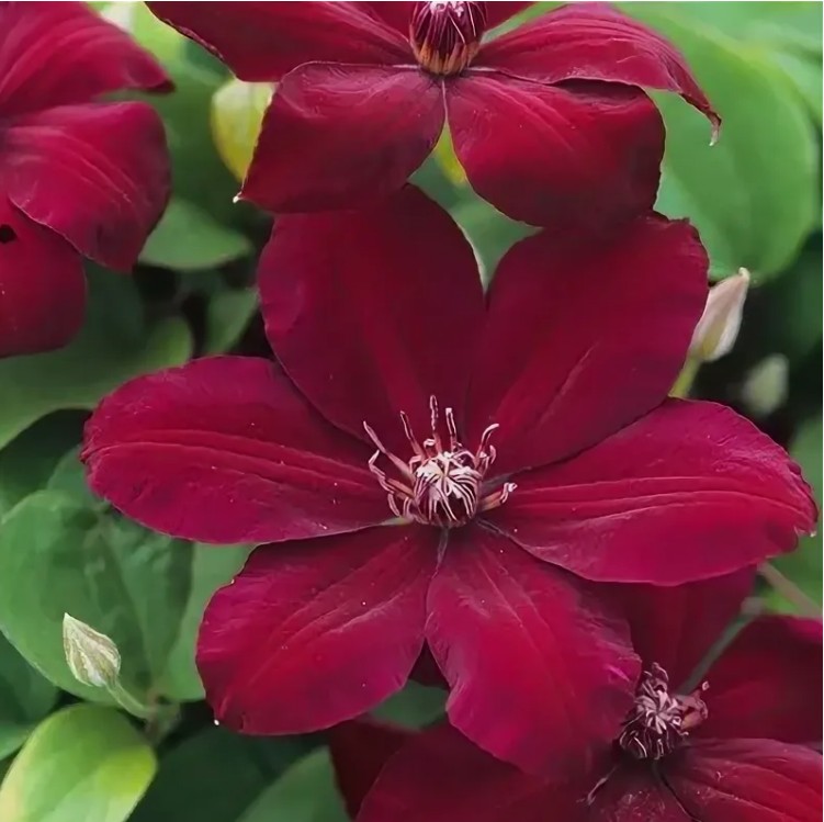 Диаметр цветков достигает 16 см. Окраска – глубокий гранатово-бордовый тон, устойчивый к выгоранию. Лепестки бархатные, шелковистые, с контрастными светлыми (белыми или кремовыми) тычинками и темно-красными пыльниками – комбинация смотрится особо выразительно. Гибкие побеги вытягиваются до 3 м, что позволяет создавать эффектные вертикальные композиции. При удачном размещении и грамотном уходе «Вестерплатте» способен украшать участок десятилетиями.