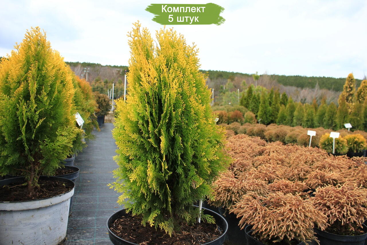 Приобретите комплект из пяти саженцев Туи Восточной, каждый из которых имеет высоту от 40 до 60 см. Эти вечнозелёные красавицы станут украшением вашего сада, придав ему изысканность и благородный вид.