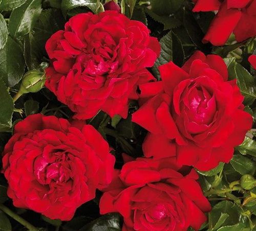 Цветы Гранд Эвод имеют насыщенный красный оттенок, который не выгорает на солнце, и изысканный аромат, наполняющий сад приятными нотками. Крупные махровые бутоны, достигающие в диаметре до 10 см, собраны в эффектные соцветия, что делает эту розу идеальной для вертикального озеленения, арок, пергол и беседок.